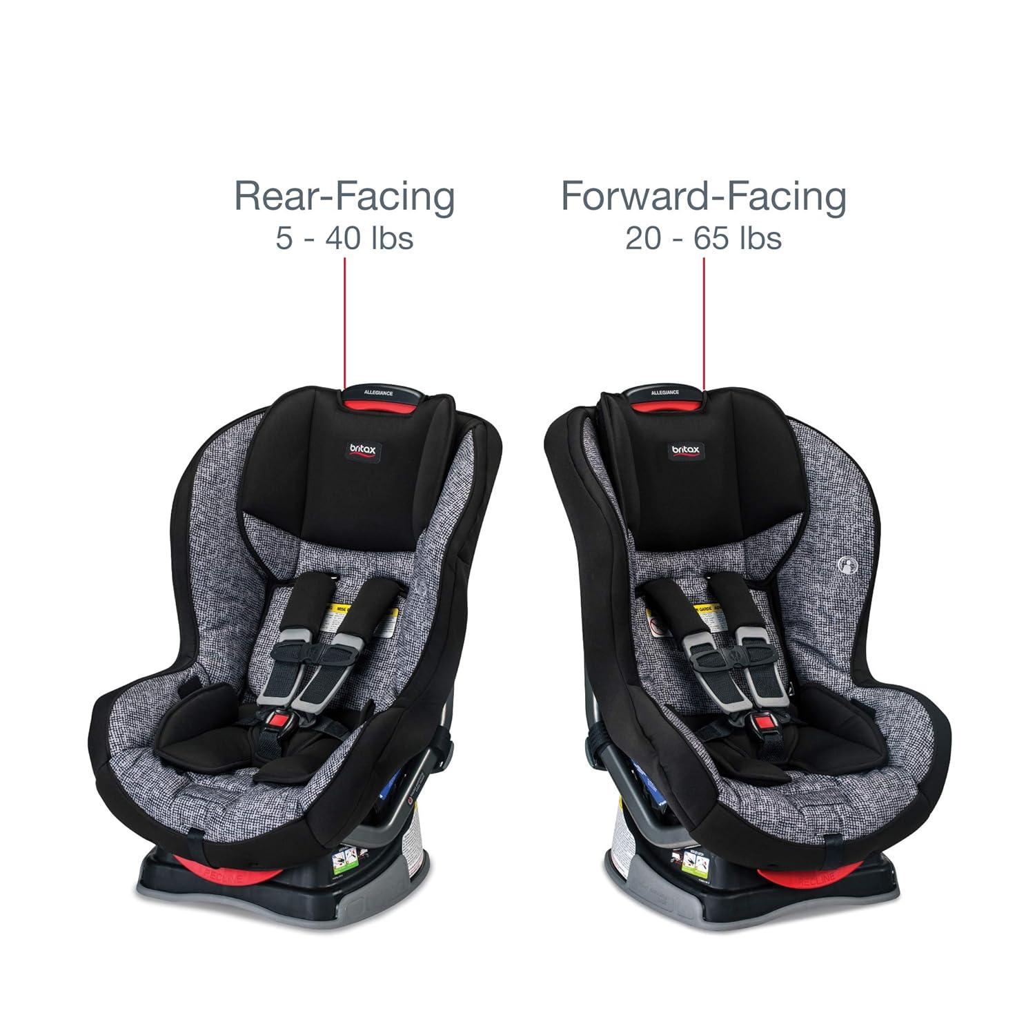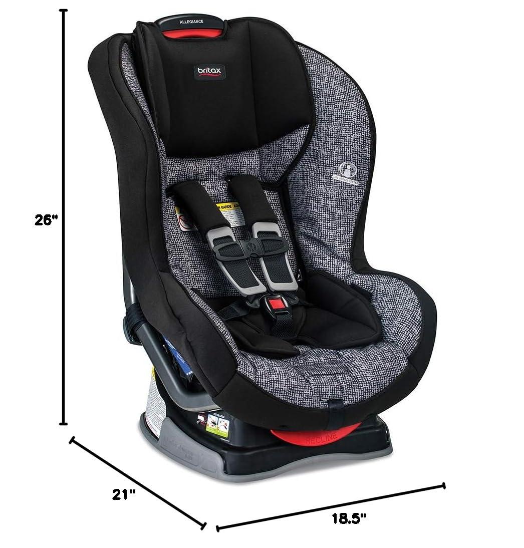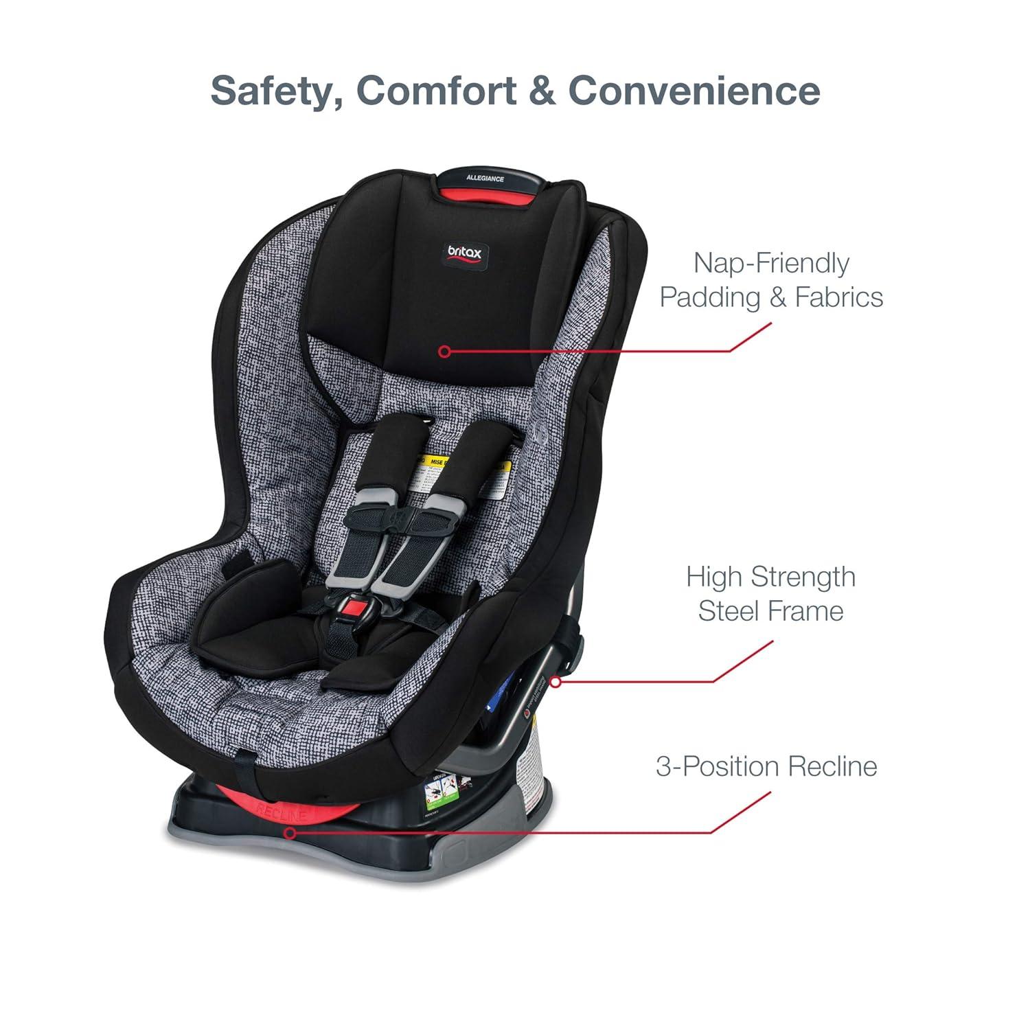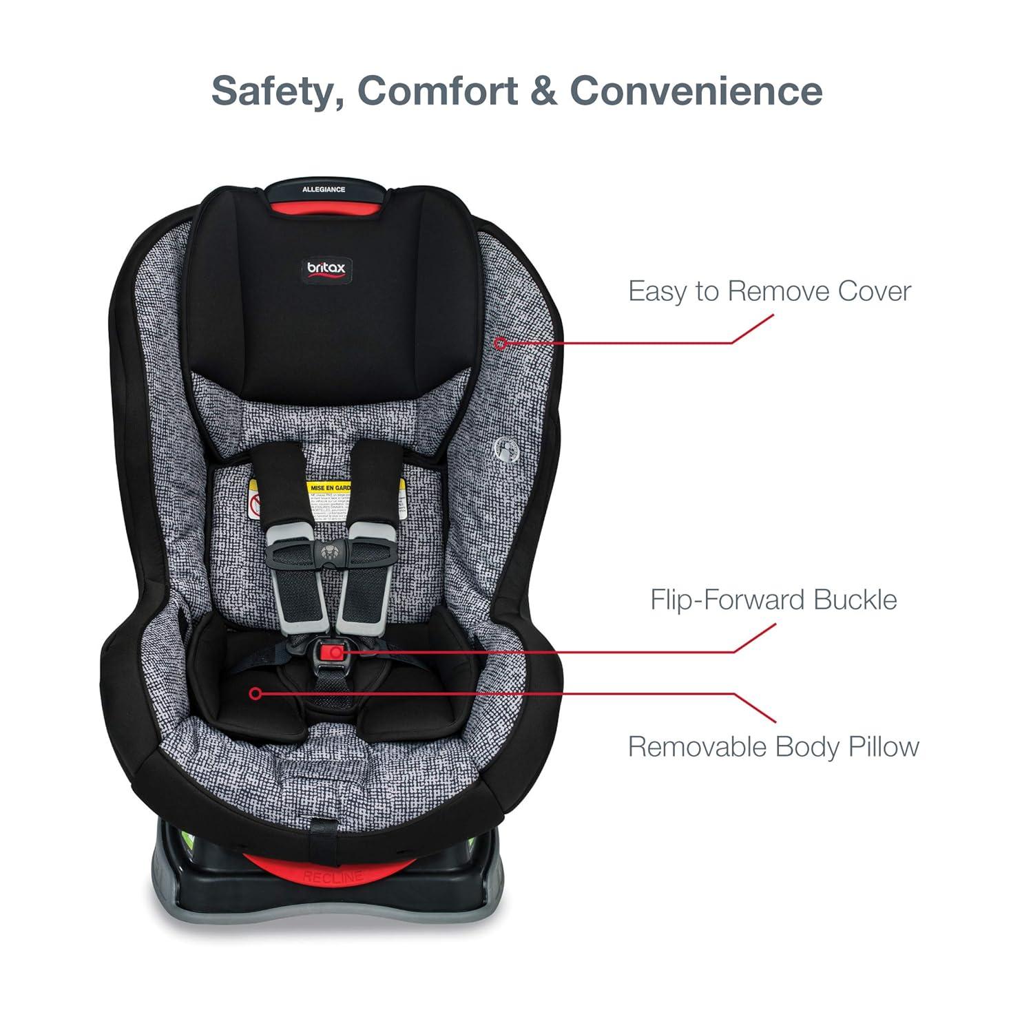 The allegiance convertible car seat is safe and comfortable for your growing child while you are on the go. Car seat installation is a breeze with push button latch connectors and built in lock offs. Designed with Britax safety technologies, the allegiance car seat features the patented Britax safe cell impact protection system, which includes side impact protection, a steel frame, impact absorbing base, and forward movement reducing v shaped tether. The allegiance convertible car seat is made with a strong layer of side energy absorption; a foam-lined shell will shield your child from side impacts in the event of a collision. In addition, foam padding and three recline positions keep your baby comfortable and cozy along the way, while the 10 position easy adjust harness and headrest allows you to never have to re thread again. The allegiance car seat can be used rear facing 5-40 pounds and forward facing 20-65 pounds, child standing height 49″ or less. Car seat dimensions 18.5″ w x 26″ h x 21″ d. 10 position harness slot heights 8.5″ to 17.5″. FAA approved. Removable body pillow ensures even small newborns fit snuggle in the seat.