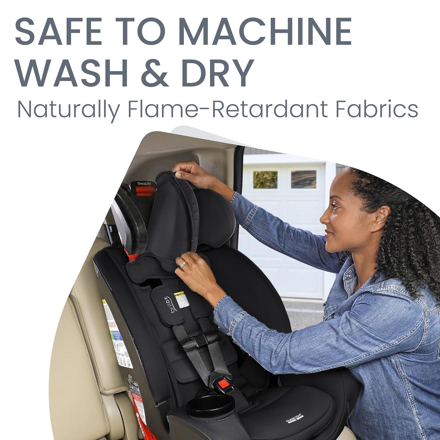 Enjoy safe travels from birth to big kid with the Britax One4Life all-in-one car seat. This car seat features 4 configurations, including rear facing infant car seat, rear facing toddler car seat, forward facing 5 point harness car seat, and forward facing high back booster seat. Start with the rear facing car seat for infants and toddlers, then graduate to the forward facing car seat and booster car seat for preschoolers and big kids. ClickTight technology makes it easy to install your new baby car seat with confidence. Simply open the seat, follow the path to thread the seat belt, buckle it, and click the seat closed. The One4Life all in one car seat is outfitted with a high-strength steel frame, a SafeCell crumple zone, and a patented V-shaped tether. The protective seat shell and foam-lined headrest help absorb impact energy and are designed to help keep your child's head, neck, and body safe. Adjust the 15-position headrest and no-rethread harness at the same time, so you can find a secure fit in seconds. Quickly adjust between 9 recline positions and use the easy-read level indicators to find the correct angle. The Britax One4Life comes with an easy-to-remove, machine-washable cover, and the knit construction is naturally flame-retardant.